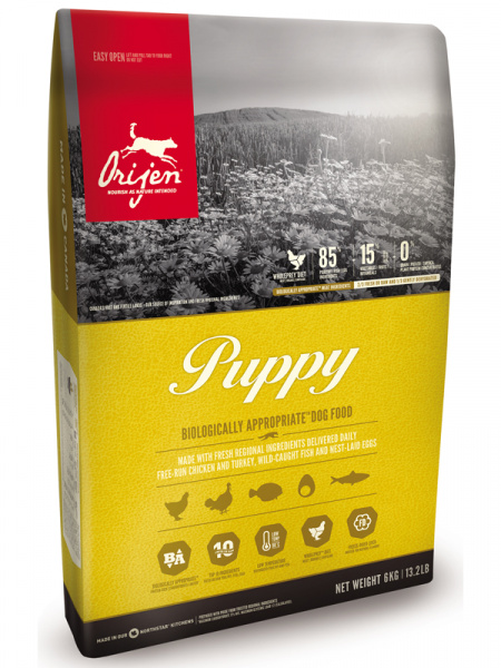 Корм ORIJEN содержит 38% высокопитательного белка и всего 17% низкогликемических углеводов, что обеспечивает щенкам рацион, соответствующий их эволюционным и биологическим потребностям.